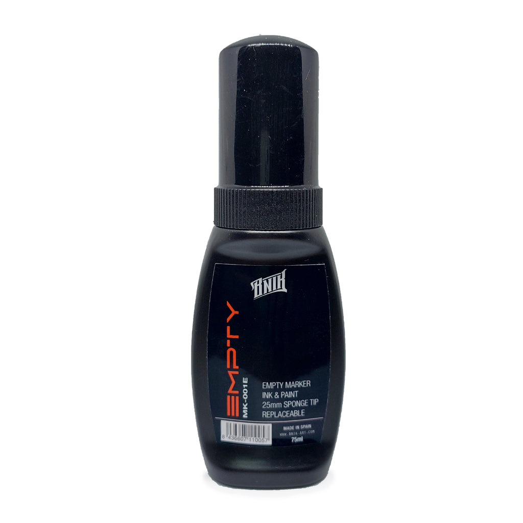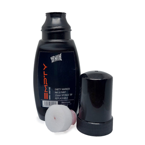 Mop, clásico limpiador de zapatos vacío, para rellenar con tinta o pintura líquida. Punta redonda de esponja de 25mm, ideal para superficies lisas, que permite líneas gruesas y homogéneas. Cuerpo flexible que permite controlar los aportes extra de tinta a la punta para crear chorreos. Marcador de 75ml recargable y con puntas intercambiables.