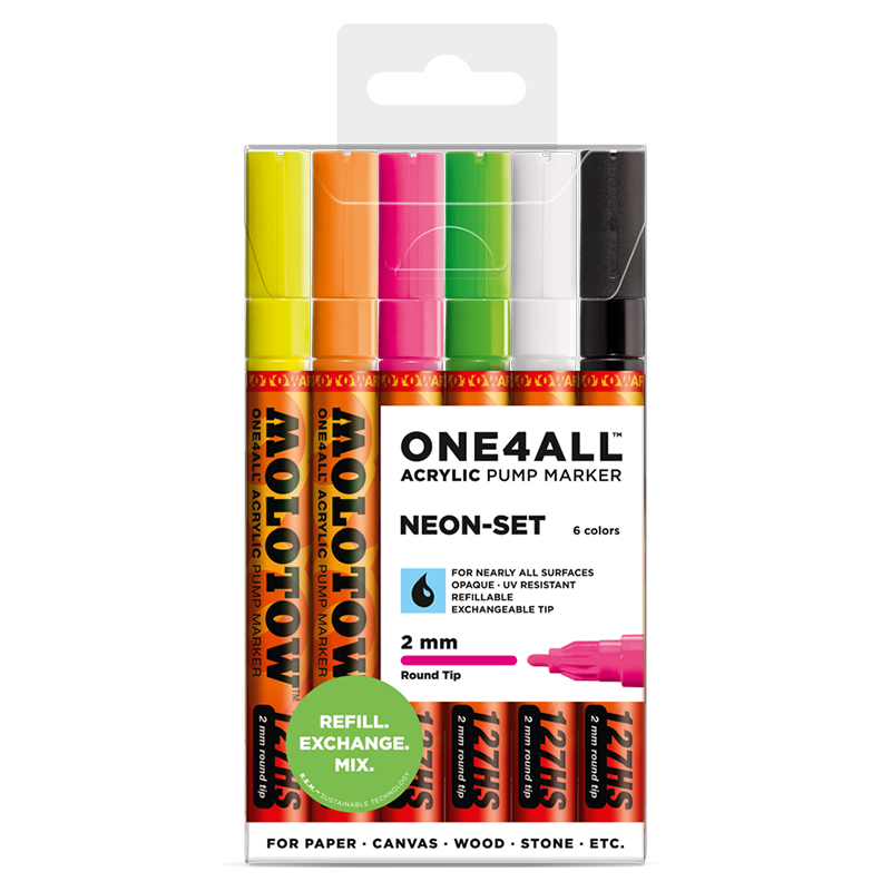 6 rotuladores acrílicos recargables, con punta redonda intercambiable de 2mm. Pintura líquida de alta cubrición, acabado mate y secado rápido. Recargables y con puntas intercambiables.
