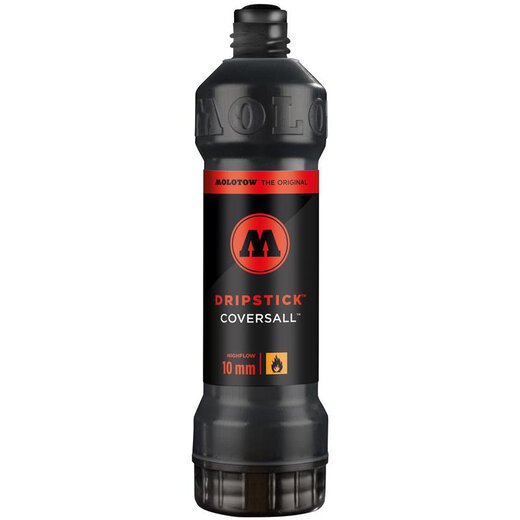 Rotulador permanente con punta de poliéster High-Flow 10mm. Tinta negra brillante base alcohol de alta cubrición y secado rápido. Recargable con tinta negra brillante Coversall. Puntas intercambiables. Control del aporte de tinta a la punta en función de la presión que se aplique sobre el cuerpo del rotulador, lo que permite conseguir trazos únicos y chorreados. Capacidad 70ml. Con sistema de rosca para recargar de forma sencilla por la parte inferior sin sacar la punta.