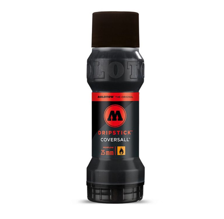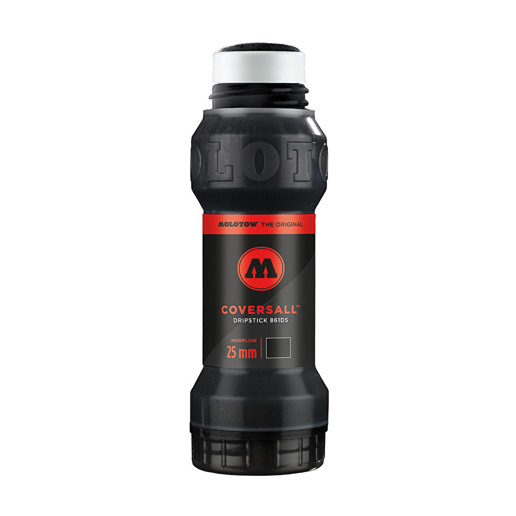 Rotulador permanente con punta de poliéster High-Flow 25mm. Tinta negra brillante base alcohol de alta cubrición y secado rápido. Recargable con tinta negra brillante Coversall. Puntas intercambiables. Control del aporte de tinta a la punta en función de la presión que se aplique sobre el cuerpo del rotulador, lo que permite conseguir trazos únicos y chorreados. Capacidad 100ml. Con sistema de rosca para recargar de forma sencilla por la parte inferior sin sacar la punta.