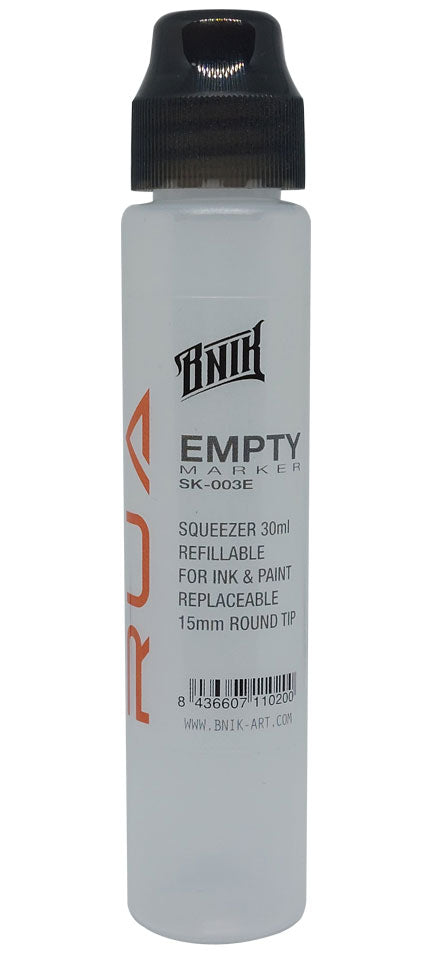Rotulador vacío con punta de poliéster 15mm. Recargable con cualquier tipo de tinta o pintura líquida. Puntas intercambiables. Control del aporte de tinta a la punta en función de la presión que se aplique sobre el cuerpo del rotulador, lo que permite conseguir trazos únicos y chorreados. Capacidad 30ml.